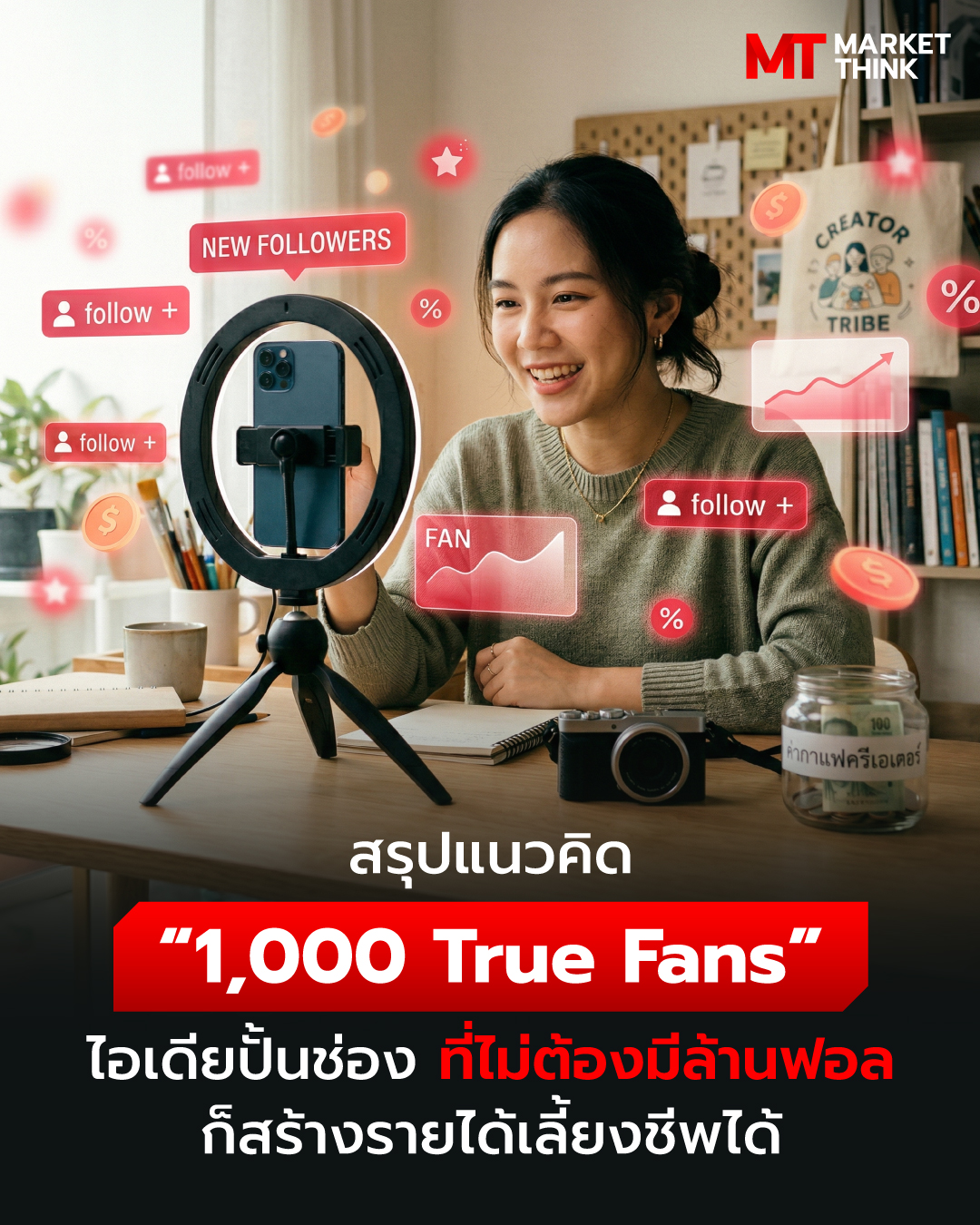 คุณ Kevin Kelly ผู้ร่วมก่อตั้งนิตยสาร Wired เจ้าของแนวคิด 1,000 True Fans บอกว่า ไม่จำเป็นต้องมีผู้ติดตามถึงหลักแสนหรือล้านเลย ขอแค่ 1,000 คน ก็สามารถทำเป็นอาชีพได้แล้ว