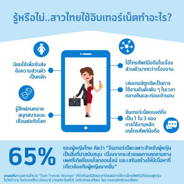 เทเลนอร์กรุ๊ปเผยผลสำรวจล่าสุด เป็นข้อมูลเชิงลึกที่น่าสนใจเกี่ยวกับอุปนิสัยและค่านิยมต่อการใช้งานโทรศัพท์มือถือของผู้หญิงในวัยทำงานจากการสำรวจ “Tech Trends: Women” ผู้หญิงใช้โทรศัพท์เพื่อความบันเทิงส่วนตัวเป็นหลักและพวกเธอก็ต้องการให้มีอินเทอร์เน็ตสำหรับผู้หญิงมากขึ้น เพื่อลดการคุกคามทางเพศผ่านรูปแบบคอมเมนต์ทางอินเทอร์เน็ต ดร.เอริก้า กิ๊บสัน รองประธานฝ่ายการจัดการผลิตภัณฑ์และการค้นคว้าวิจัยด้านผู้ใช้งาน เทเลนอร์กรุ๊ป กล่าวว่า ผู้หญิงถือว่าโทรศัพท์มือถือเป็นหนี่งในเครื่องมือที่ช่วยพวกเธอออกแบบการใช้ชีวิตที่มีความสมดุลระหว่างการทำงานและการใช้ชีวิตส่วนตัว แต่ผลสำรวจกลับพบว่าโทรศัพท์มือถือมีอิทธิพลต่อการทำงานของพวกเธอน้อยกว่าที่เราคาดไว้ เนื่องจากกลุ่มผู้หญิงวัยทำงานที่มีการศึกษาสูงมักใช้โทรศัพท์มือถือเพื่อความบันเทิง การติดต่อสื่อสารในชีวิตส่วนตัว เพื่อหยุดพักจากชีวิตการทำงานอันวุ่นวาย จากการสำรวจครั้งนี้ ได้แสดงข้อมูลเชิงลึกที่ชัดเจนและมีประโยชน์อย่างมากเกี่ยวกับอุปนิสัยและความต้องการต่อบริการดิจิทัลของผู้ใช้งานหญิง ซึ่งเป็นสิ่งที่แบรนด์ต้องการทำความเข้าใจ เนื่องจากเรารู้ดีว่าผู้หญิงเป็นผู้ใช้งานกลุ่มใหญ่ในบริการดิจิทัลและข้อมูลข่าวสาร อย่างไรก็ตาม การสำรวจจากกลุ่มตัวอย่างที่เป็นผู้หญิงวัยทำงานที่มีอายุระหว่าง 25-40 ปี ในมาเลเซีย เมียนมาร์ นอร์เวย์ สิงคโปร์ สวีเดน และไทย เพื่อสำรวจความหลากหลายของระบบเศรษฐกิจ สังคมและการเมือง ระดับของการพัฒนาอุตสาหกรรม และอัตราการเข้าถึงโทรศัพท์มือถือ การใช้งานหลักบนโทรศัพท์มือถือของผู้หญิง โดยประมาณ 50-80% ของกลุ่มตัวอย่างหญิงทั้ง 6 ประเทศ พบว่า พวกเธอใช้งานโซเชียลมีเดียมากที่สุด แอพพลิเคชันรับส่งข้อความตามมาเป็นอันดับสองในประเทศส่วนใหญ่ ยกเว้นในสิงคโปร์ ที่แอพพลิเคชันรับส่งข้อความถูกใช้มากที่สุดเป็นอันดับแรก การอ่านข่าวเป็นคำตอบอันดับต้น ๆ ในนอร์เวย์และเมียนมาร์ ส่วนการฟังเพลงถูกจัดเป็นอันดับสามในสวีเดนและสิงคโปร์ ส่วน WiFi Calling ที่เป็นที่นิยมในปัจจุบัน กลับถูกผู้หญิงชาวมาเลเซียและเมียนมาร์ละเลย เพราะพวกเธอยังคงนิยมการโทรแบบปกติ ซึ่งเป็นหนึ่งในสามอันดับแรกของการใช้งานหลักของพวกเธอ เป็นที่น่าสนใจว่า “อัตราการใช้งานโทรศัพท์มือถือสำหรับงานและชีวิตส่วนตัว แตกต่างกันระหว่างโลกตะวันตกและโลกตะวันออก” ผู้หญิงชาวนอร์เวย์และสวีเดน ระบุว่า การใช้โทรศัพท์มือถือในการทำงานเป็นกิจกรรมอันดับท้ายๆ และพวกเธอพยายามตั