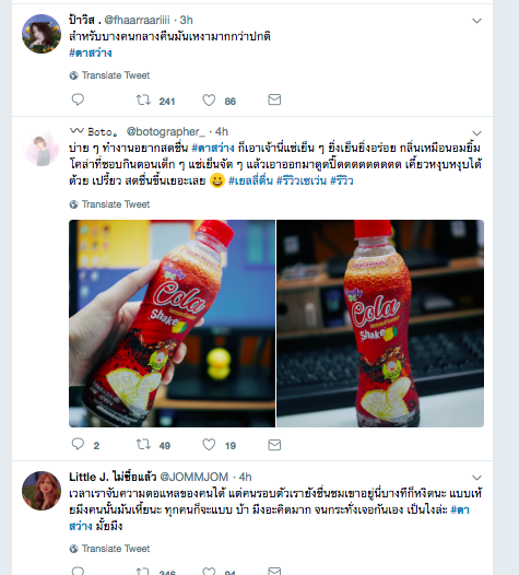 ในวันหยุดแบบนี้ แน่นอนว่าสิ่งที่ค้นหาบนมือถือเป็นประจำ คงหนีไม่พ้นเรื่องของกินและที่เที่ยว และช่วงสายวันนี้ก็ส่องหาร้านเด็ด เมนูอร่อยบน Twitter และได้เจอกับแฮชแท็ก #ตาสว่าง ที่ขึ้นมาเป็นอันดับหนึ่ง ซึ่งแน่นอนว่า นอกจากเรื่องดราม่าความรักครั้งเก่าหรือการหักหลังเพื่อนแล้ว สิ่งที่แหวกมาอย่างน่าสนใจคือเครื่องดื่ม Cola Lemon นั่นเอง ออกตัวก่อนว่า นี่ไม่ใช่ Advertorial แค่เห็นบนฟีดในทวิตเตอร์แล้ว อยากลองเฉยๆ ยิ่งอ่านรีวิวบนทวิตด้วยแล้ว ยิ่งอยากบึ่งออกไปหาซื้อมาลองเลยทีเดียว แต่เหมือนเห็นการรีทวิตของ Hashtagintrend ก็จะรู้ว่าตกลงแล้วเป็นการทำคอนเทนต์ของแบรนด์ใด ทำอย่างไรให้น่าสนใจ ความน่าสนใจของแฮชแท็กเครื่องดื่มนี้คือ จุดประเด็นเสมือนไม่ได้เป็นการโฆษณาของแบรนด์เครื่องดื่มยี่ห้อดังกล่าวเลย แต่บังเอิญมีคนตามหาเครื่องดื่มที่กินแล้วสดชื่น และมีคนที่เคยลิ้มลองหรือลงทุนไปหาซื้อมาชิมที่ร้านสะดวกซื้อและถ่ายรูปมาโชว์กันมากมาย จุดเด่นของกระแสที่ส่งต่อมานั้น ต้องการนำเสนอว่าเป็นเครื่องดื่มที่อยากให้ลิ้มลอง เพราะช่วยให้ไม่ง่วงในยามบ่ายที่ต้องทำงานหรือไม่มีอะไรทำแก้เบื่อและทานแล้วตาสว่างไม่ง่วงอีก กลยุทธ์การทำตลาดด้วยทวิตเตอร์ไม่ใช่เรื่องยากอีกต่อไปแล้วนะคะ หากรู้จักใช้ให้เหมาะสมและต้องรู้ก่อนว่ากลุ่มเป้าหมายของเราอยู่ที่ไหน ใช้ช่องทางการส่งสารให้ถูกต้อง ย่อมสร้างโอกาสในการเป็นที่รู้จักได้แน่นอนค่ะ