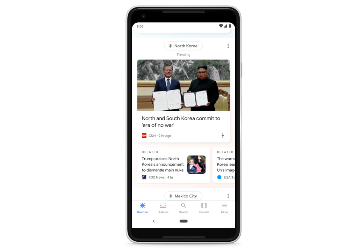 Google ได้ประกาศปรับปรุงระบบนำเสนอเนื้อหาที่อ้างอิงกับประวัติการค้นหาผู้ใช้ Feed เป็นชื่อใหม่ Discover เมื่อตอนฉลองครบรอบ 20 ปี และเปลี่ยนปุ่มใช้ชื่อว่า Home เป็น Discover ซึ่งตอนนี้ Google ก็เริ่มปล่อย Discover ใหม่ให้ผู้ใช้ได้ใช้งานแล้วทางเว็บไซต์ Google.com บนมือถือ
