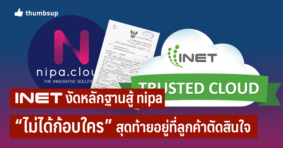 จากที่ก่อนหน้านี้ทางเพจ thumbsup ได้แชร์กรณี “Nipa.Cloud ฟ้อง INET เรียกค่าเสียหายทั้งหมด 1 บาท” โดยทาง INET ได้ออกมาชี้แจงกรณีดังกล่าวผ่านทางเฟซบุ๊กเพจเฟสบุคของบริษัทเกี่ยวกับกรณีดังกล่าวแล้ว ออกจดหมายชี้แจง คำชี้แจง กรณี Nipa.Cloud ฟ้องเรียกค่าเสียหาย INET และบริษัทในเครือ บริษัท อินเทอร์เน็ตประเทศไทย จำกัด (มหาชน) (ที่มา : INET Cloud ) เนื่องด้วยลูกค้าได้สอบถามกรณี เพจเฟสบุ๊ค Thumbsup in Thailand ลงข้อความ “Nipa.Cloud ฟ้อง INET เรียกค่าเสียหายทั้งหมด 1 บาท” นั้น บริษัท อินเทอร์เน็ตประเทศไทย จำกัด (มหาชน) “บริษัท” ขอชี้แจงในกรณีดังกล่าวดังต่อไปนี้ บริษัทดำเนินธุรกิจเป็นผู้ให้บริการโครงสร้างพื้นฐานด้าน ICT แบบครบวงจร สำหรับธุรกิจและผู้ที่ต้องการนำ ICT มาเป็นเครื่องมือเพื่อเสริมสร้างความสามารถในการแข่งขันทางธุรกิจ บริการของบริษัทเน้นการขาย Local …
