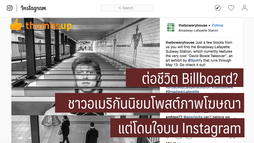 Nielsen ย้ำสถิติไม่ธรรมดา เพราะวันนี้พบชาวอเมริกันจำนวนไม่น้อยนิยมโพสต์ภาพโฆษณาโดนใจที่พบเห็นบนสื่อกลางแจ้งเช่น Billboard หรือโฆษณา outdoor อื่นบน Instagram ทำให้วันนี้นักโฆษณาตื่นตัวและมีแนวโน้มลงทุนกับสื่อ outdoor มากขึ้น การโพสต์ภาพโฆษณา Billboard บน Instagram นี้ถูกเรียกว่า Instagramming Billboard การสำรวจล่าสุดพบว่าพฤติกรรม Instagramming Billboard นั้นกำลังทำให้นักโฆษณาปรับเปลี่ยนวิธีการลงทุน เนื่องจากพบว่าชาวอเมริกัน 1 ใน 4 คน ลงมือโพสต์ภาพโฆษณากลางแจ้งบน Instagram แล้ว ทำให้การสำรวจของ Nielsen ครั้งนี้สามารถสรุปได้ว่า การลงทุนโฆษณา 1 ครั้งบนป้าย Billboard ใน 1 เมืองพร้อมข้อความ 1 ประโยค ก็สามารถแพร่หลายไปทั่วโลกได้ทันทีเช่นกัน จากบริการออนไลน์สู่ OOH ที่น่าสนใจ ตัวอย่างที่สำคัญคือในเดือนเมษายนที่ผ่านมา เวลานั้นบริการเพลงอย่าง Spotify เปลี่ยนสถานี Broadway-Lafayette ซึ่งเป็นสถานีรถไฟใต้ดินในมหานครนิวยอร์ก ให้เป็นนิทรรศการศิลปะของ David Bowie …