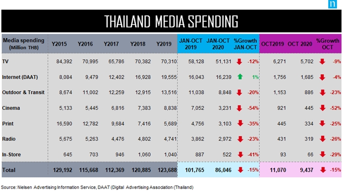 เอจีบี นีลเส็น ประเทศไทย เปิดเผยถึง ‘มูลค่าเม็ดเงินโฆษณา’ ช่วงมกราคม - ตุลาคมปี 2563 มีมูลค่าอยู่ที่ 86,046 ล้านบาท -15% เมื่อเทียบกับช่วงเดียวกันของปีที่ผ่านมา ขณะที่ภาพรวมเม็ดเงินโฆษณาในเดือนตุลาคมลดลง –15% จากช่วงเดียวกันของปีที่แล้ว หรือมีมูลค่าอยู่ที่ 9,437 ล้านบาท