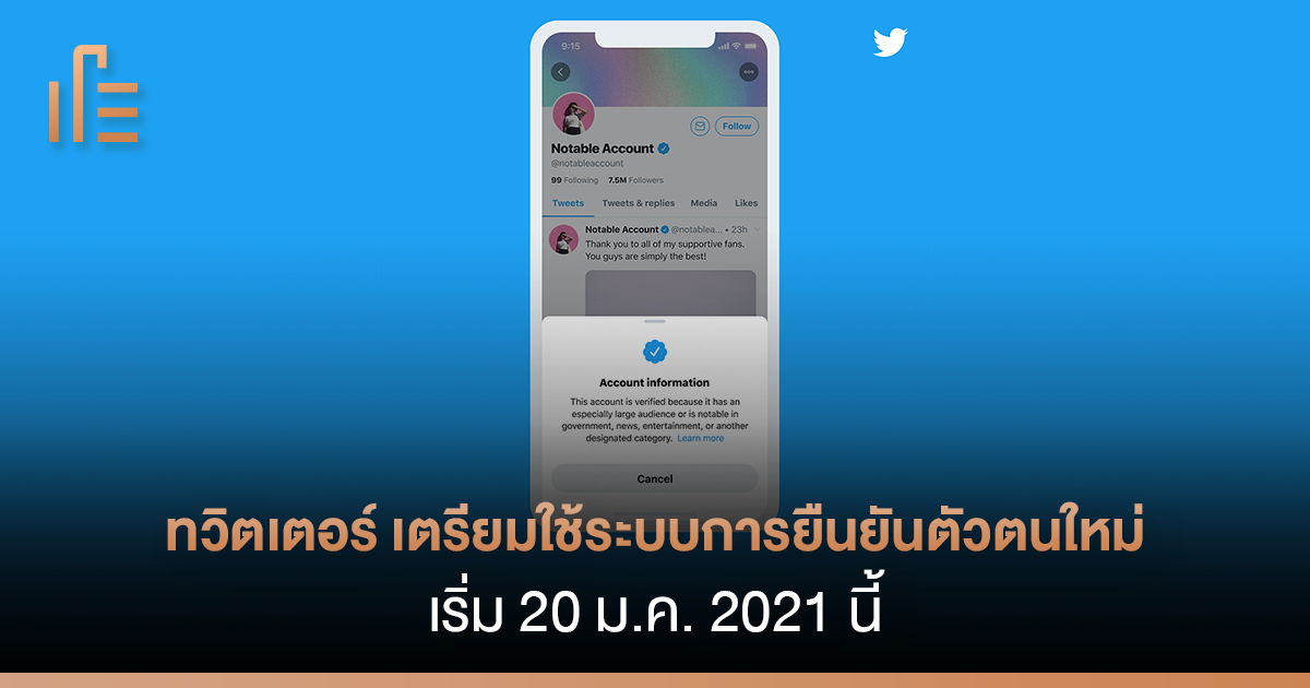 ทวิตเตอร์จะเริ่มใช้ นโยบายการยืนยันตัวตนใหม่ บนทวิตเตอร์ ตั้งแต่วันที่ 20 มกราคม 2564 เป็นต้นไป ซึ่งจะทำการลบเครื่องหมายติ๊กถูกสีฟ้า ออกจากบัญชีที่ไม่ได้มีการใช้งานและบัญชีที่ไม่สมบูรณ์โดยอัตโนมัติ ดังนั้นผู้ใช้ทวิตเตอร์ จะต้องทำการยืนยันตัวตนใหม่ เพื่อไม่ให้ถูกลบจากระบบยืนยันตัวตน หลังจากที่ทวิตเตอร์ (Twitter) ประกาศนโยบายของการยืนยันตัวตนใหม่บนทวิตเตอร์สำหรับปี 2021 รวมถึงขอรับฟีดแบ็กจากผู้ใช้งานผ่านแฮชแท็ก #VerificationFeedback จากผู้คนบนทวิตเตอร์นั้น ทางทวิตเตอร์ได้มีการเปิดเผยเกี่ยวกับฟีดแบ็กที่ได้รับเอาไว้ดังนี้ เราได้รับฟีดแบ็กในส่วนของเกณฑ์การพิจารณาตรงโปรไฟล์ว่าจะต้องมีข้อมูล “ครบสมบูรณ์” ซึ่งทำให้ทุกคนรู้สึกว่าเป็นการจำกัดมากเกินไป จึงได้อัปเดตคำจำกัดความใหม่โดยไม่จำเป็นต้องมีข้อมูลของโปรไฟล์หรือภาพเฮดเดอร์ เราได้อัปเดตข้อมูลอ้างอิงบน Wikipedia เพื่อให้มีความสอดคล้องกับมาตรฐานการเผยแพร่บทความของสารานุกรมเพื่อให้มีคุณภาพและโดดเด่นมากขึ้น เพื่อความชัดเจนและมีความครอบคลุมมากยิ่งขึ้น จากเดิมที่เป็นหมวดหมู่ของ “ข่าว” เราได้เพิ่มเป็นหมวดหมู่ของ “ข่าวและนักข่าว” และในส่วนของหมวดหมู่ “กีฬา” มีการเพิ่มเป็น “กีฬาและอีสปอร์ตส” นอกจากนี้ ยังได้เพิ่มส่วนของดิจิทัลคอนเทนท์ครีเอเตอร์ เข้าไปในหมวดหมู่ “ความบันเทิง” ด้วยเพื่อให้มีความชัดเจนมากยิ่งขึ้น เราได้รับฟีดแบ็กในเรื่องของข้อกำหนดของจำนวนผู้ติดตามขั้นต่ำที่นับตามฐานของแต่ละประเทศ ซึ่งอาจจะไม่ใช่แนวทางที่ถูกต้องในการพิจารณาเสมอไป ทั้งนี้ จึงได้อัปเดตการพิจารณาจำนวนผู้ติดตามที่อ้างอิงตามฐานของแต่ละภูมิภาค เพื่อให้ข้อกำหนดในการนับจำนวนผู้ติดตามมีความเสี่ยงต่อการถูกสแปมน้อยลงและมีความเท่าเทียมต่อประชากรในทุกพื้นที่มากขึ้น สำหรับใครที่สนใจนโยบายยืนยันตัวตนใหม่ของทวิตเตอร์สามารถเข้าใช้ได้ผ่านแอปพลิเคชันในหน้าตั้งค่า โดยขั้นตอนจะมีการถามผู้สมัครให้เลือกหมวดหมู่ในการยืนยันสถานะและจะมีการตอบรับผ่านทางลิงก์และอาจจะต้องใช้เอกสารอื่นๆ ประกอบ โดยบัญชีที่มีความสมบูรณ์จะต้องมีหนึ่งในข้อกำหนดดังต่อไปนี้ จะต้องมีการยืนยันอีเมลหรือเบอร์โทรศัพท์อย่างใดอย่างหนึ่ง มีรูปภาพโปรไฟล์ แสดงชื่อผู้ใช้งาน สำหรับบัญชีของใครที่มีความเสี่ยงจะสูญเสียเครื่องหมายยืนยันตัวตน เจ้าของบัญชีจะได้รับแจ้งทางอีเมลอัตโนมัติและมีการแจ้งเตือนจากในแอปการใช้งานของทวิตเตอร์ว่าจะต้องเข้าไปเปลี่ยนแปลงอะไรบ้าง หากคุณเข้าไปปฏิบัติตามคำแน
