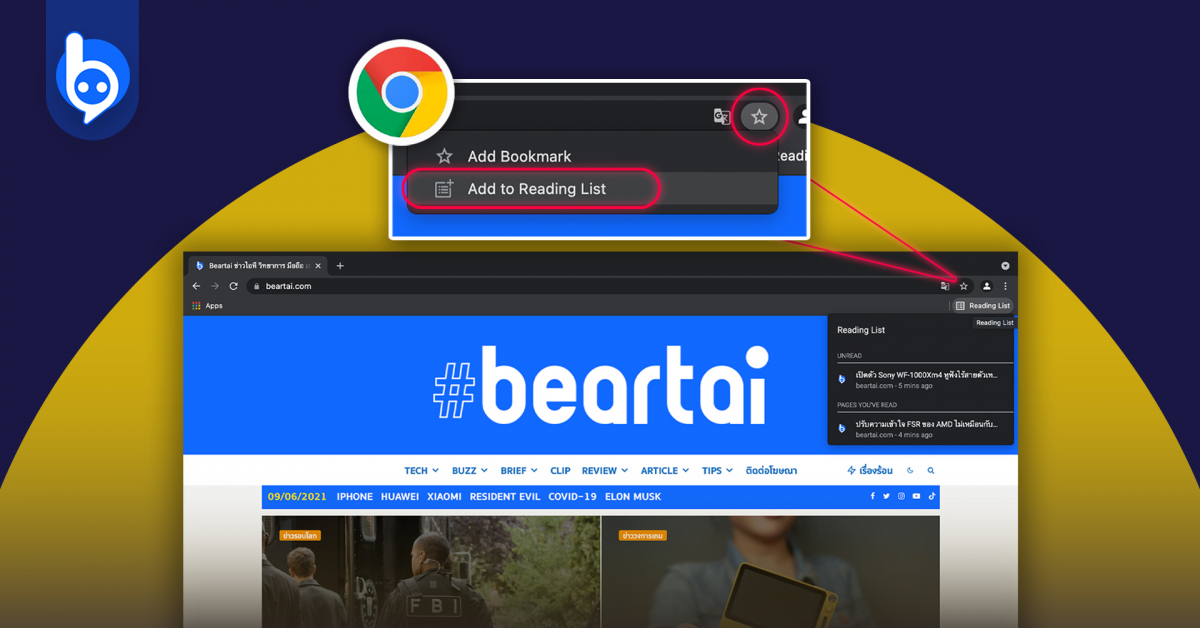 https://www.beartai.com/wp-content/uploads/speaker/post-664452.mp3?cb=1623420221.mp3 ตอนที่เราเจอเว็บ หรือบทความที่ชอบแต่ยังไม่มีเวลาอ่านส่วนมากเราก็จะกดเก็บเข้า Bookmark เอาไว้ก่อนเพื่อเอามาอ่านทีหลัง แต่ปัญหาของ Bookmark ก็คือเราไม่รู้เลยว่าเราอ่านอันไหนไปแล้วบ้าง พอจะลบ Bookmark ทีก็ต้องกดหลายปุ่มเหลือเกิน ตอนนี้ Google Chrome ได้เพิ่มฟีเจอร์ใหม่ที่จะให้เราเก็บบทความมาอ่านทีหลังได้อย่างง่าย ๆ มาแล้ว Reading List นั้นถูกออกแบบมาเพื่อเก็บหน้าเว็บหรือบทความมาอ่านทีหลังเพื่อแยกกับ Bookmark ที่เอาไว้เก็บหน้าเว็บที่เราเข้าบ่อย ๆ โดยจะออกแบบมาให้คนที่ต้องการอ่านบทความหรือหน้าเว็บแล้วลบทิ้งได้อย่างง่าย ๆ ไม่ยุ่งยาก วิธีการใช้นั้นก็ง่ายดายมาก ๆ พอเราเจอบทความที่อยากอ่านให้กดที่รูปดาวด้านขวาสุดของช่อง URL เหมือนกับการกดเซฟ Bookmark พอกดแล้วจะมีตัวเลือกให้ 2 อย่างให้เรากดอันที่ 2 หรือ Add to Reading list แค่นี้บทความนั้นก็จะเข้าไปอยู่ใน Reading List ของเราแล้ว บทความที่เราเซฟเข้า Reading List จะไปอยู่ในแถบ Reading List ที่อยู่ด้านขวามือด้านใต้บัญชีผู้ใช้ของ Google Chrome นั่นเอง พอกดเข้าไปเราก็จะเห็นรายชื่อของบทความที่เราเซฟเข้ามาโดยบทความที่อ่านแล้วจะถูกแยกออกจากบทความที่ยังไม่ได้อ่าน โดยสามารถลบบทความได้ง่าย ๆ โดยการกดเครื่องหมายกากบาทด้านข้างบทความ หรือถ้ายังอ่านไม่จบก็สามารถกดเครื่องหมายถูกเพื่อเปลี่ยนสถานะเป็นยังไม่ได้อ่านได้ See alsoIn Game Tipsบทความวงการเกมon 13/05/2021มือใหม่ควรรู้ รวมวิธีเอาตัวรอดเบื้องต้นในเกม Resident Evil Village พิสูจน์อักษร : สุชยา เกษจำรัส
