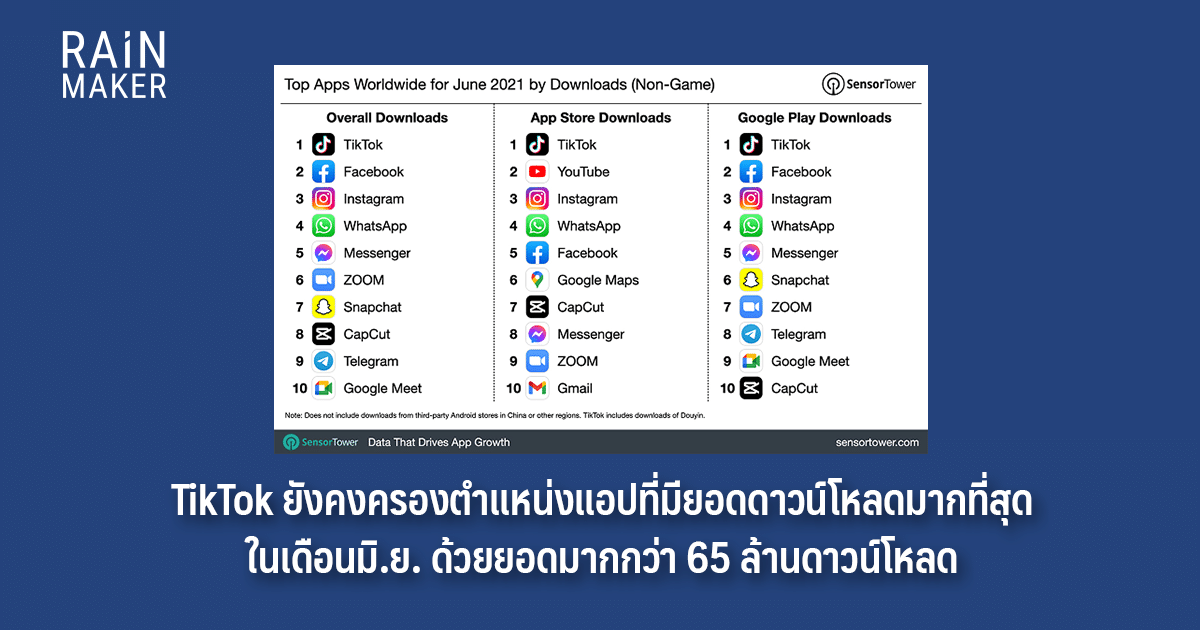 TikTok ยังคงเป็นแอปนอกเหนือจากหมวดหมู่เกม ที่มียอดดาวน์โหลดมากที่สุดในเดือนมิถุนายน 2021 ด้วยจำนวนดาวน์โหลดมากกว่า 65 ล้านครั้ง จากข้อมูลล่าสุดของ Sensor