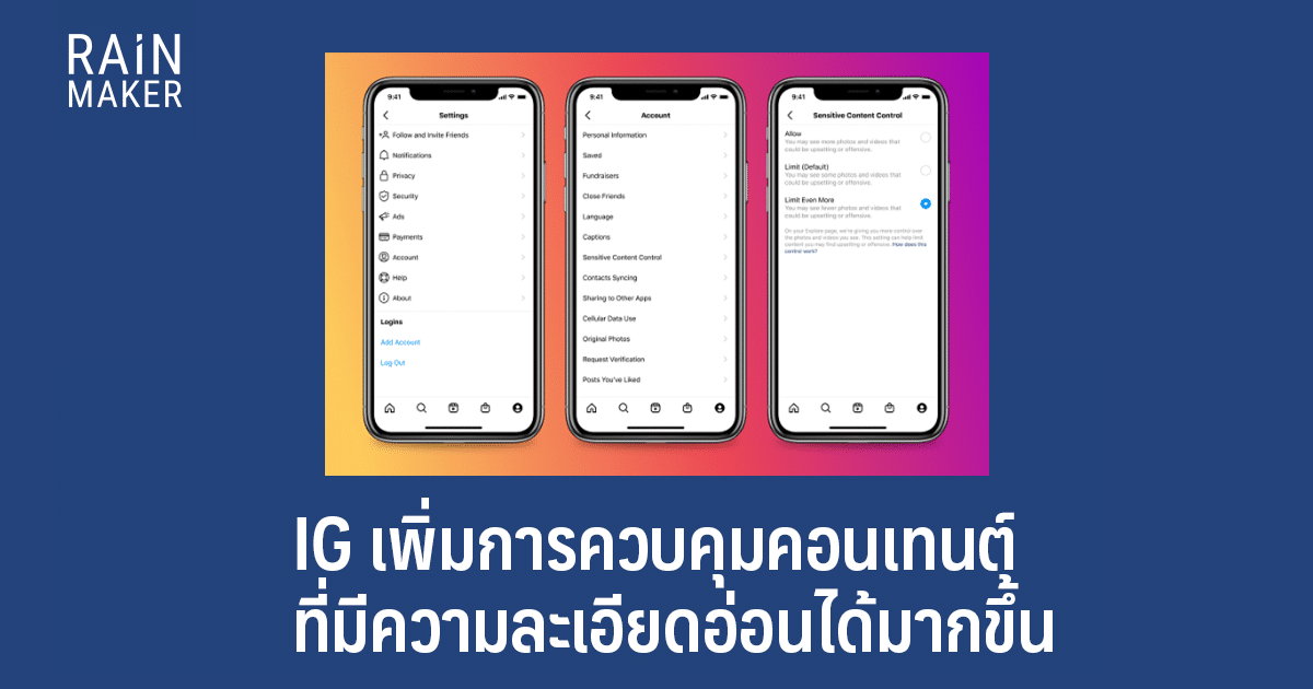 IG เพิ่มตัวเลือกใหม่ให้ผู้ใช้สามารถควบคุมหน้าไทม์ไลน์ของตัวเองได้ดียิ่งขึ้น ด้วยตัวเลือก "ควบคุมเนื้อหาที่มีความเซนซิทีฟ" ซึ่งมีตัวเลือก 3