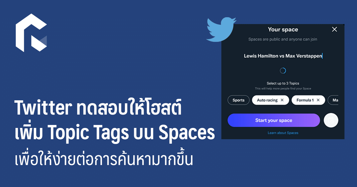 ทวิตเตอร์เพิ่มแท็กหัวข้อใน Spaces เมื่อสร้างห้อง เพื่อช่วยเพิ่มการเข้าถึง และให้ผู้ใช้ได้รับการแจ้งเตือน จากแท็กหัวข้อสิ่งที่เกี่ยวข้องกับความสนใจของตน