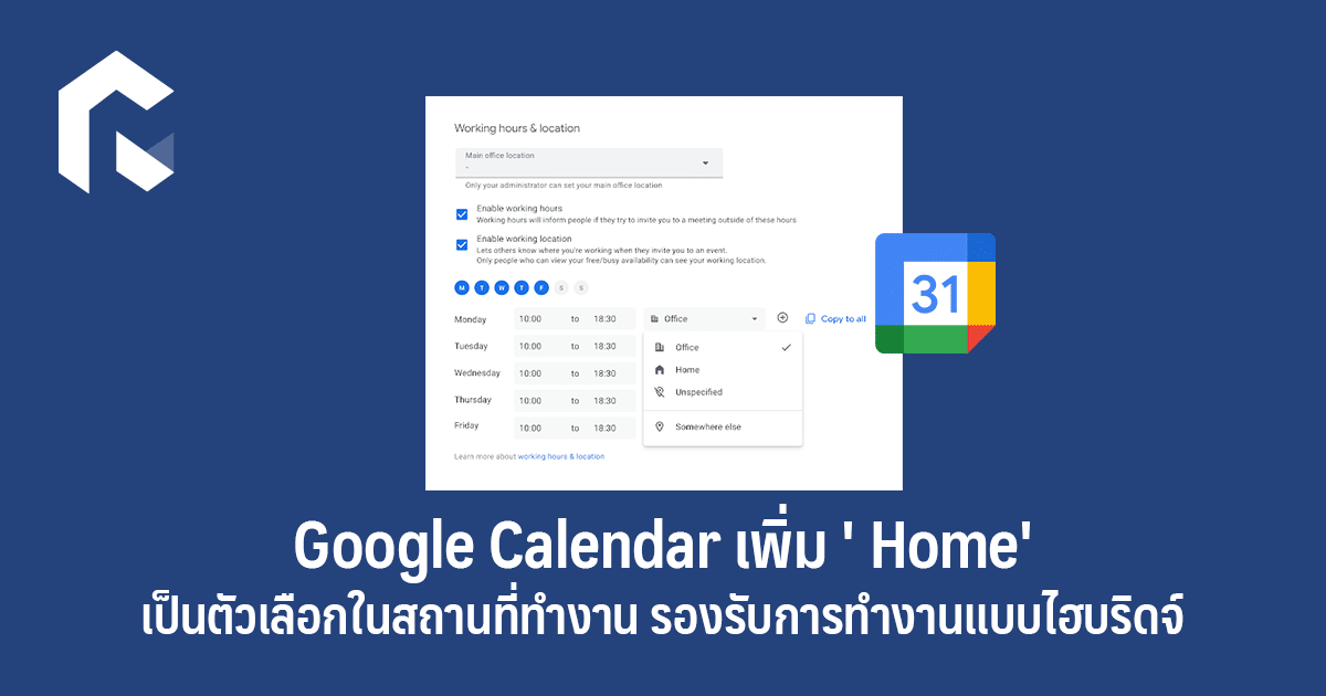 กูเกิลเพิ่ม 'Home' หรือบ้าน เป็นหนึ่งในตัวเลือกของสถานที่ทำงาน เพียงเข้าไปตั้งค่าใน Working hours & location และเลือกสถานที่ทำงาน จากนั้นสถานที่ ๆ