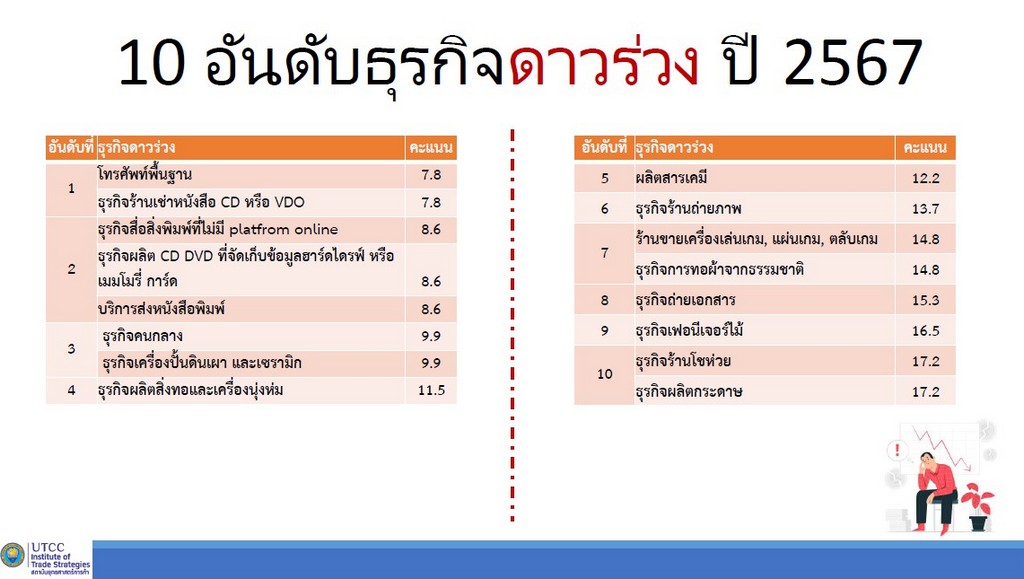 ศูนย์พยากรณ์เศรษฐกิจและธุรกิจ มหาวิทยาลัยหอการค้าไทย เปิดเผยผลสำรวจการจัดอันดับ 10 ธุรกิจดาวรุ่ง-ดาวร่วง ปี 2567