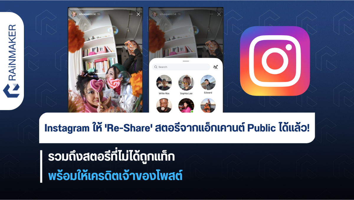 Instagram ได้เพิ่มทางเลือกใหม่สำหรับการขยายคอมมูนิตี้ผ่านคอนเทนต์ นั่นก็คือฟีเจอร์ในการเลือกแชร์ 'Public Stories' หรือการรีแชร์สตอรีจากแอ็กเคานต์สาธารณะ
