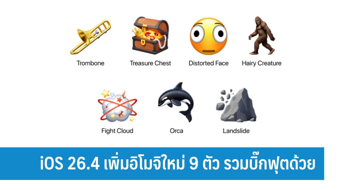 iOS 26.4 เพิ่มอิโมจิใหม่ 9 ตัว ใหม่สะดุดตา ทั้งหน้าเบี้ยว, บิ๊กฟุต และวาฬเพชฌฆาต ซึ่งเป็นส่วนหนึ่งของมาตรฐาน Unicode 17 ได้ใช้แน่เร็วๆนี้