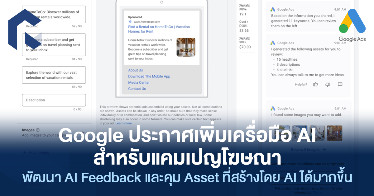 Google อัปเดตตัวช่วย AI ตัวใหม่สำหรับ Google Ads ทั้ง AI Creation, AI, AI Asset Generation, AI Parameter Controls รวมถึงพัฒนาการรายงานผลให้ดีอีกขึ้น