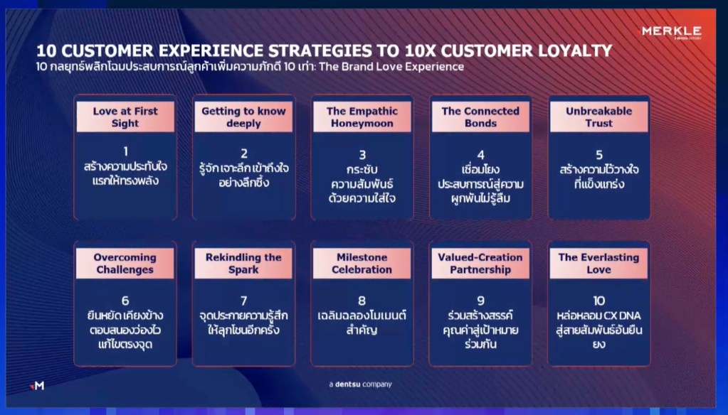 Marketing Insight & Technology Conference 2024 (MITCON2024) เซกชั่น 10 กลยุทธ์การทำ Customer Experience ที่จะทำให้ Customer Loyalty เพิ่ม 10 เท่า โดย คุณอภิรดา เบ็ญจฆรณี CEO of CXM และ MD of Merkle Thailand, dentsu ยุคนี้….ความภักดีของลูกค้าต้องเน้นมากกว่าแค่การซื้อซ้ำ แต่ไม่ใช่อีกต่อไปแล้ว…เพราะนั่น เป็นแค่เกมของ ความภักดีเชิงธุรกรรม แบรนด์มักติดกับดักให้ลูกค้าซื้อแล้วซื้ออีก จากการทำโปรโมชั่น การมอบสิทธิพิเศษจากระบบสมาชิกต่าง ฯลฯ ซึ่งนี่คือเกมของ Transactional Loyalty อนาคตปี 2035 เราจะเจอลูกค้าแบบไหน? Research จาก Merkle Thailand ระบุไว้ว่า 7 ใน 10 เชื่อว่า AI จะถูกนำมาใช้ในหลากหลายด้านของชีวิต …