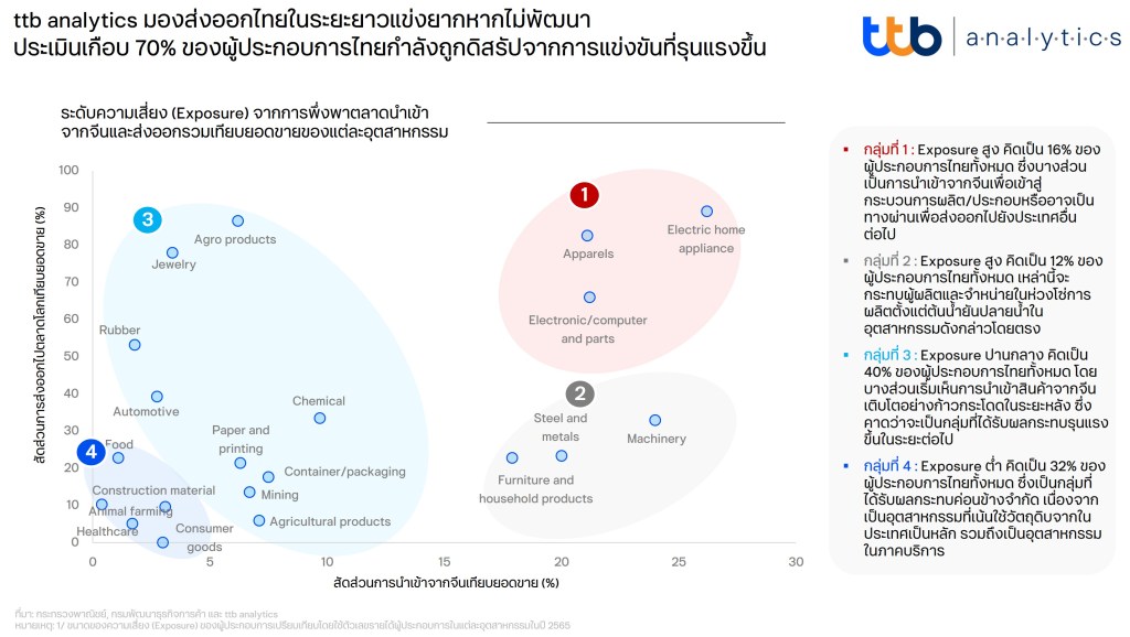 ศูนย์วิเคราะห์เศรษฐกิจ ทีทีบี หรือ ttb analytics มองการแข่งขันของภาคส่งออกไทยในตลาดโลกจะมีความท้าทายมากขึ้นในระยะข้างหน้า ทั้งจากมิติของสินค้าส่งออกหลักที่มีคู่แข่งมากขึ้น และมิติของกฎระเบียบการค้าโลกที่เข้มข้นขึ้น โดยเฉพาะอุตสาหกรรมที่พึ่งพาการส่งออกและนำเข้าจากจีนสูง รวมถึงอุตสาหกรรมที่มีการนำเข้าสินค้าจากจีนเพิ่มขึ้นอย่างมีนัยในช่วงหลัง เช่น อุตสาหกรรมอิเล็กทรอนิกส์ เครื่องใช้ไฟฟ้า คอมพิวเตอร์และส่วนประกอบ เคมีภัณฑ์ บรรจุภัณฑ์ รวมถึงยานยนต์และชิ้นส่วน ซึ่งคิดเป็นเกือบ 70% ของผู้ประกอบการไทยทั้งหมด ด้วยเหตุนี้ ผู้ประกอบการไทยจึงควรเร่งปรับตัวทั้งกลยุทธ์การค้าและการเร่งพัฒนาผลิตภัณฑ์ เพื่อให้สอดคล้องกับบริบทการค้าโลกที่เปลี่ยนไปอย่างรวดเร็ว ชี้ความสามารถในการแข่งขันของภาคส่งออกไทยลดต่ำลงในทุกมิติ ในช่วงไม่กี่สิบปีที่ผ่านมา ภาคส่งออกมีความสำคัญต่อระบบเศรษฐกิจไทยเพิ่มขึ้นอย่างก้าวกระโดด แต่สิ่งที่น่าสนใจ คือ ส่วนแบ่งตลาดของสินค้าส่งออกไทยในตลาดโลกแทบจะไม่เปลี่ยนแปลงเลยตลอดระยะเวลา 3 ทศวรรษ สะท้อนจากสัดส่วนส่งออกไทยเทียบตลาดโลกประมาณ 1% ในปี 2536 และเพิ่มขึ้นเป็น 1.2% เท่านั้นในปี 2566 ขณะที่บทบาทของสินค้าส่งออกสำคัญของไทยซึ่งถือเป็น “Product Champion” มาตลอดหลายสิบปีกลับลดลงต่อเนื่องและมีแนวโน้มแข่งขันได้ยากขึ้น เนื่องจาก ประเด็นแรก สินค้าส่งออกที่มีมูลค่าเพิ่มน้อยไม่สามารถขยายไปตลาดใหม่ ๆ ได้ แม้สินค้าเกษตรและอาหารแปรรูปจะครองส่วนแบ่งตลาดได้มากขึ้น แต่กลับมีการกระจุกตัวอยู่เพียง 2-3 ตลาด ซึ่งมีส่วนแบ่งรวมกันสูงถึง 30-90% ของมูลค่าส่งออกในสินค้ากลุ่มนี้ …