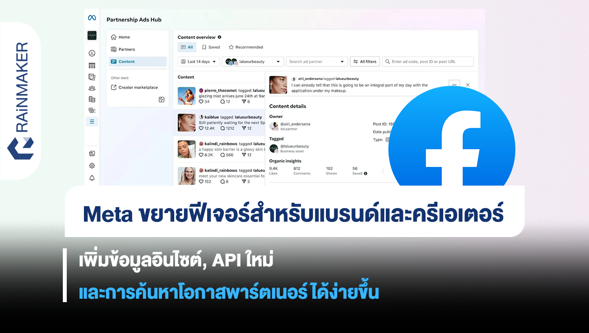 Meta อัปเดตเครื่องมือและตัวเลือกใหม่เพื่อช่วยให้แบรนด์สร้าง Partnership Ads กับครีเอเตอร์ได้ง่ายขึ้น โดยเพิ่มฟีเจอร์ค้นหาโอกาสร่วมงาน,