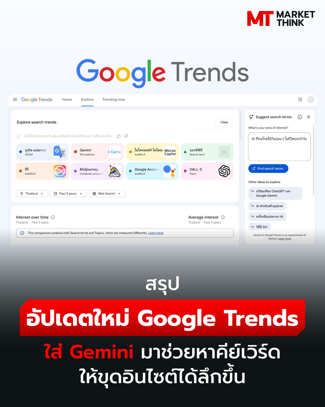 Google ได้อัปเดต Google Trends ซึ่งเป็นเครื่องมือที่ใช้สำรวจความนิยมของคีย์เวิร์ด ที่คนใช้ค้นหาบนเว็บไซต์ Google โดยได้เพิ่มความสามารถของ Gemini เข้ามาให้ใช้ฟรี