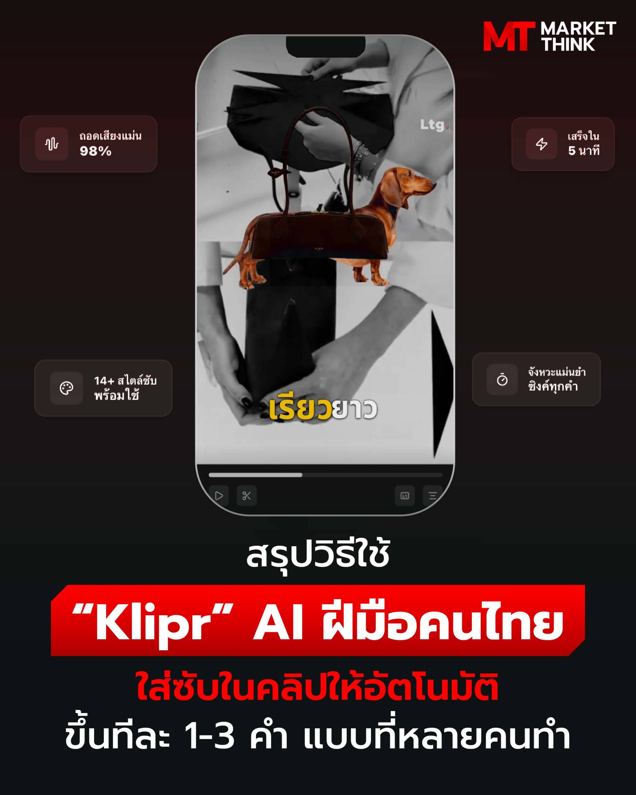 นักพัฒนาชาวไทย ทำคลิปแนะนำ AI ตัวใหม่ ชื่อว่า “Klipr” เป็นเครื่องมือช่วยครีเอเตอร์ใส่ซับไทเทิลอัตโนมัติ พร้อมแบ่งคำให้ขึ้นทีละคำ ใช้เวลาไม่ถึง 5 นาที